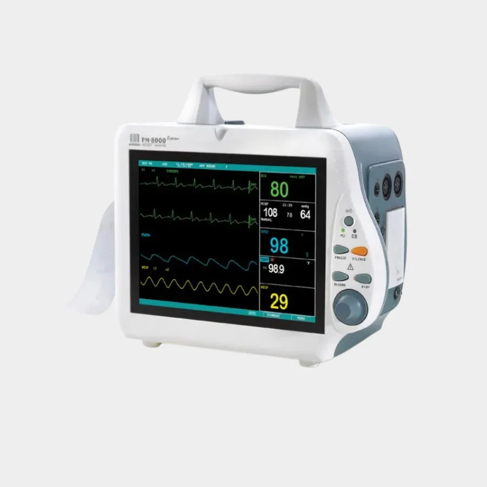 The Mindray PM8000 Cardiac Monitor is a reliable patient monitoring system that provides accurate real-time readings of ECG, SpO₂, NIBP, and respiration. Compact and user-friendly, it is ideal for ICUs, wards, hospitals, and clinics.
