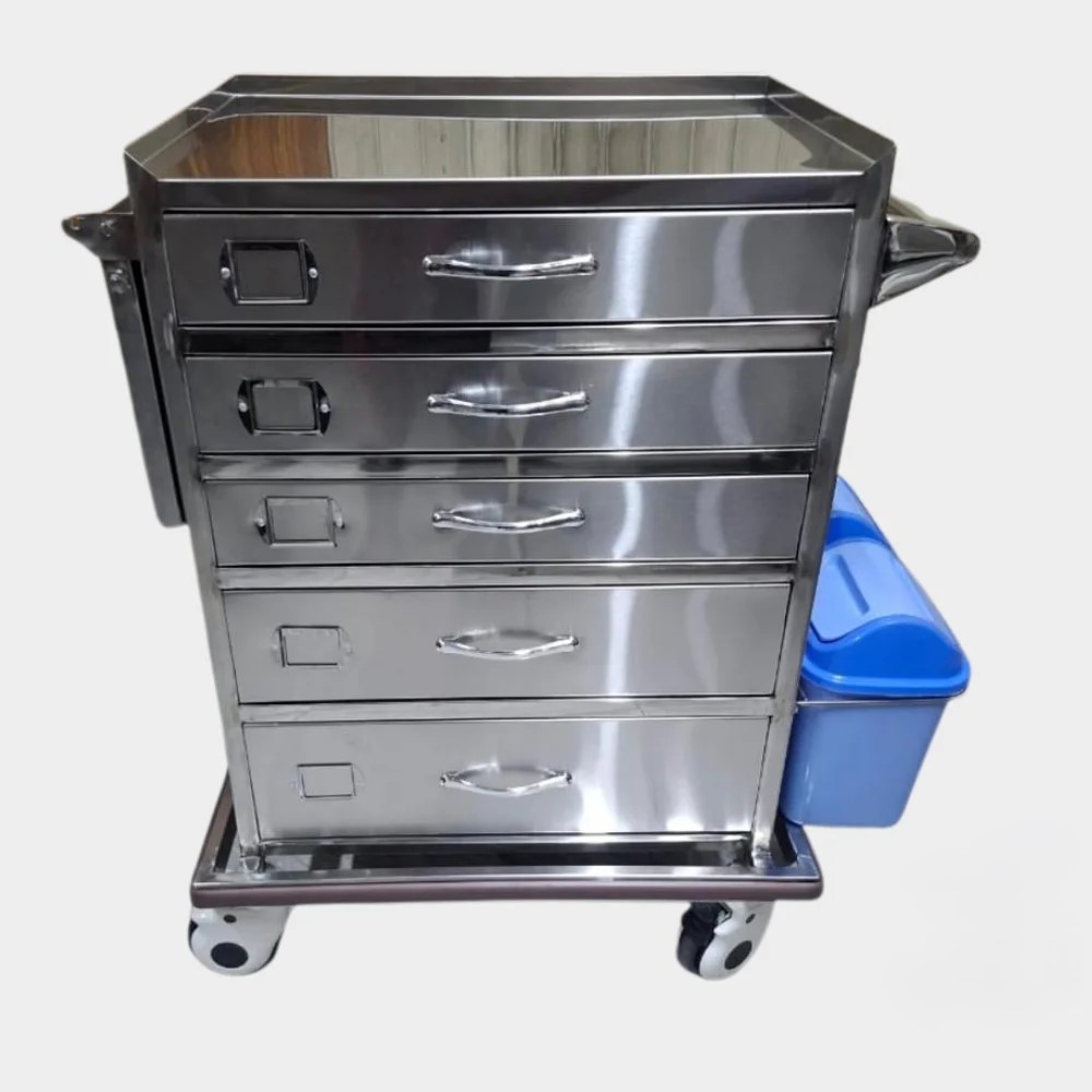 • Multi-Tiered Storage System: Features a configuration of 4 to 6 smooth-sliding drawers of varying depths, allowing for the organized segregation of medications, intubation kits, and IV supplies.